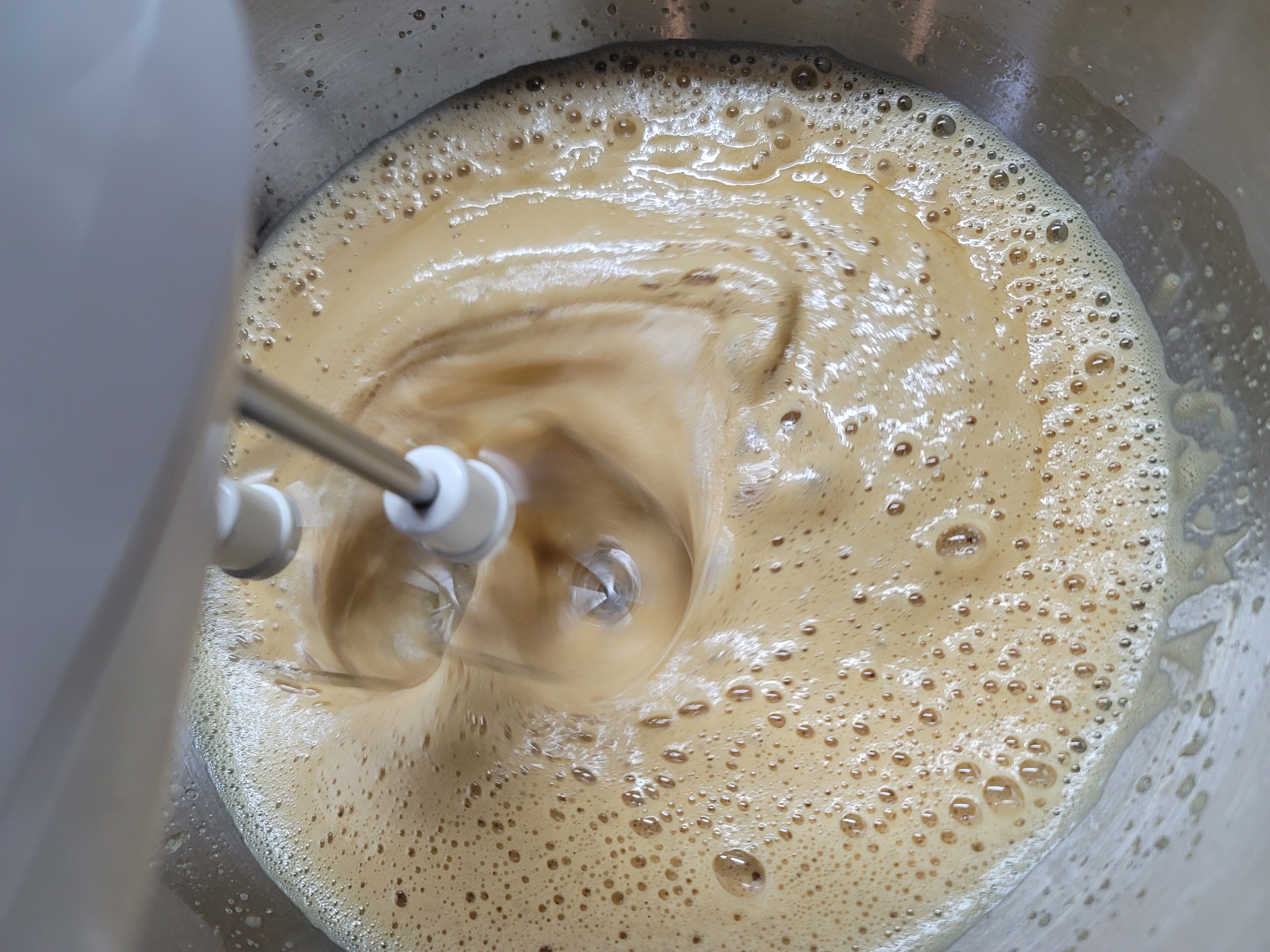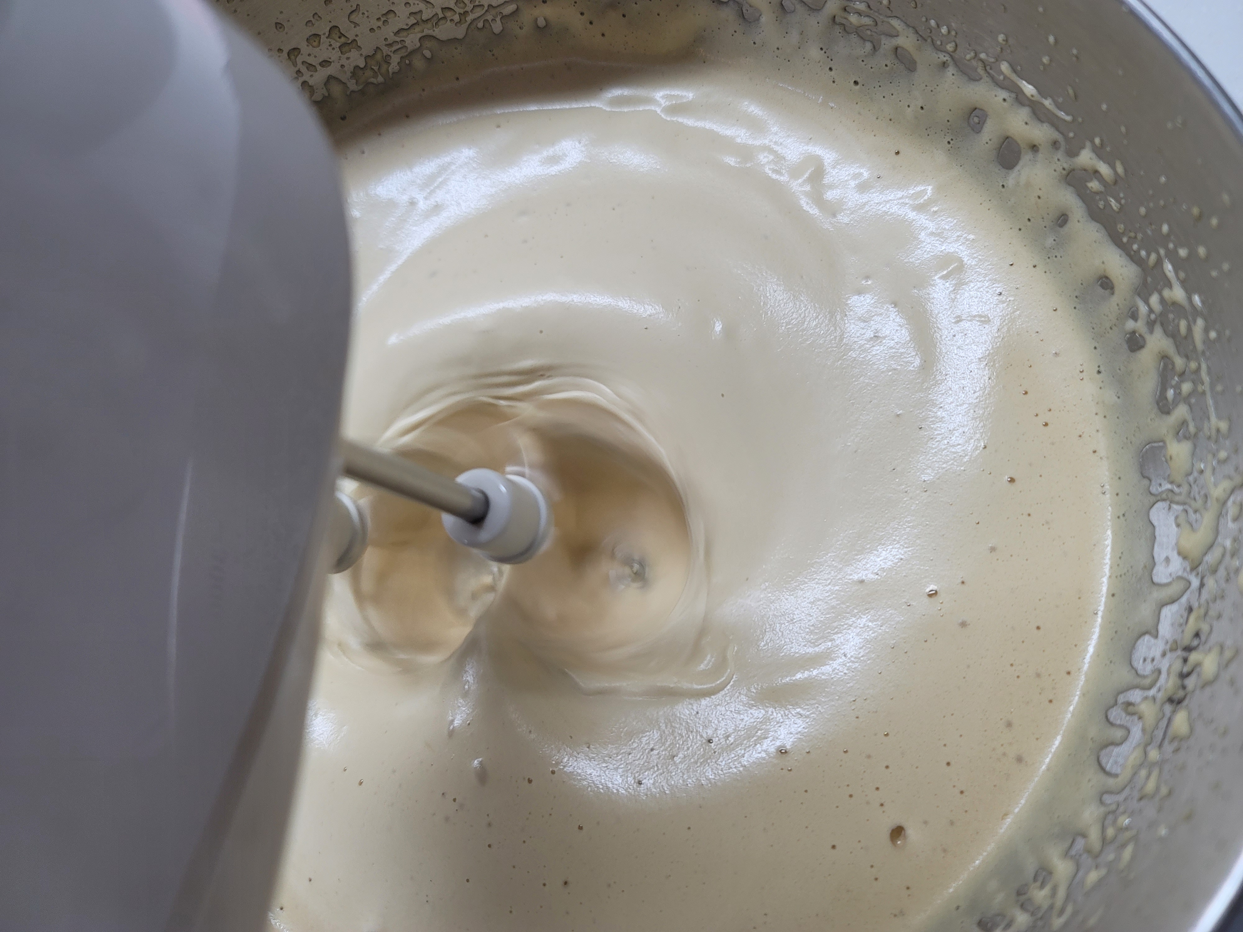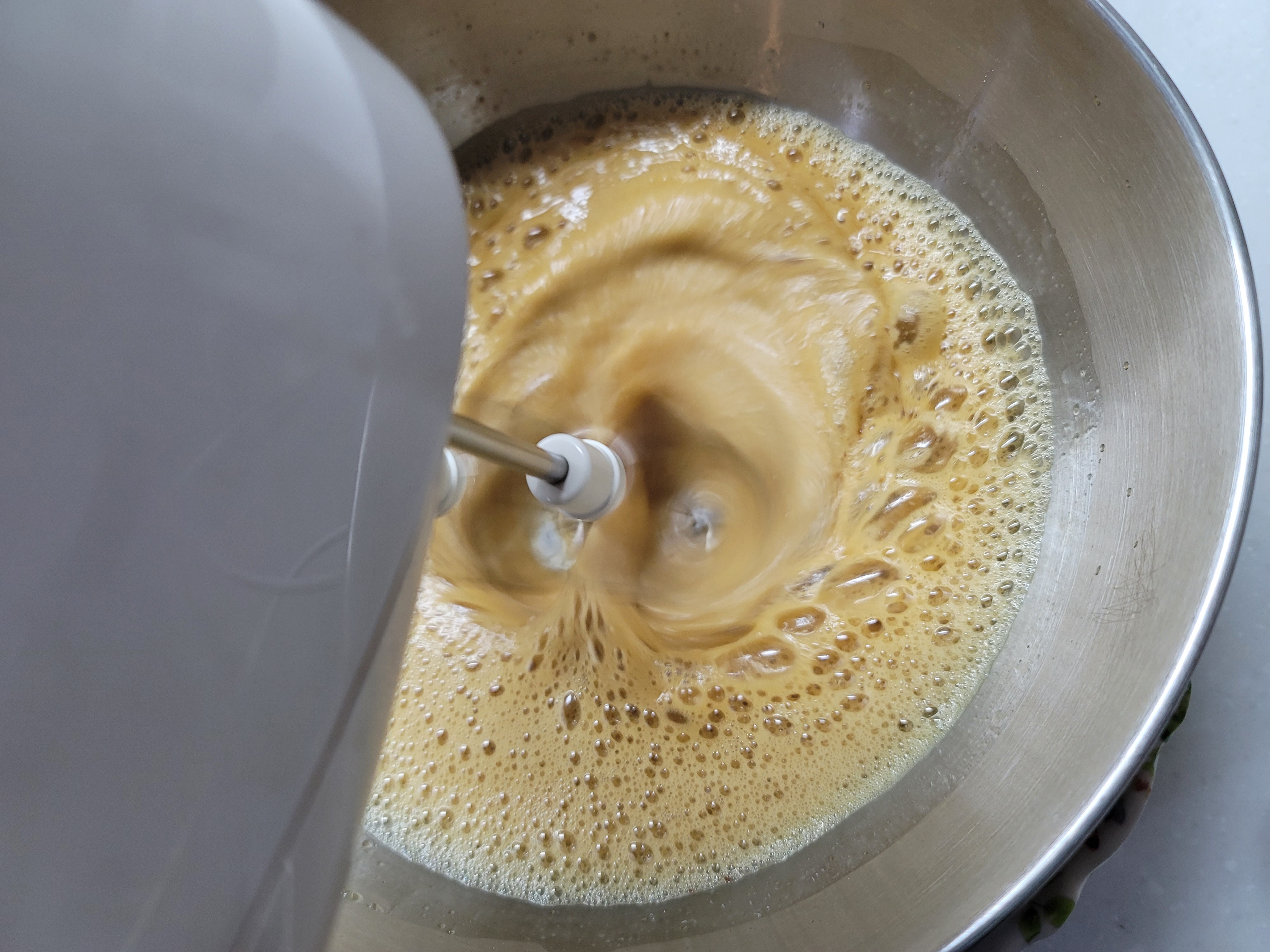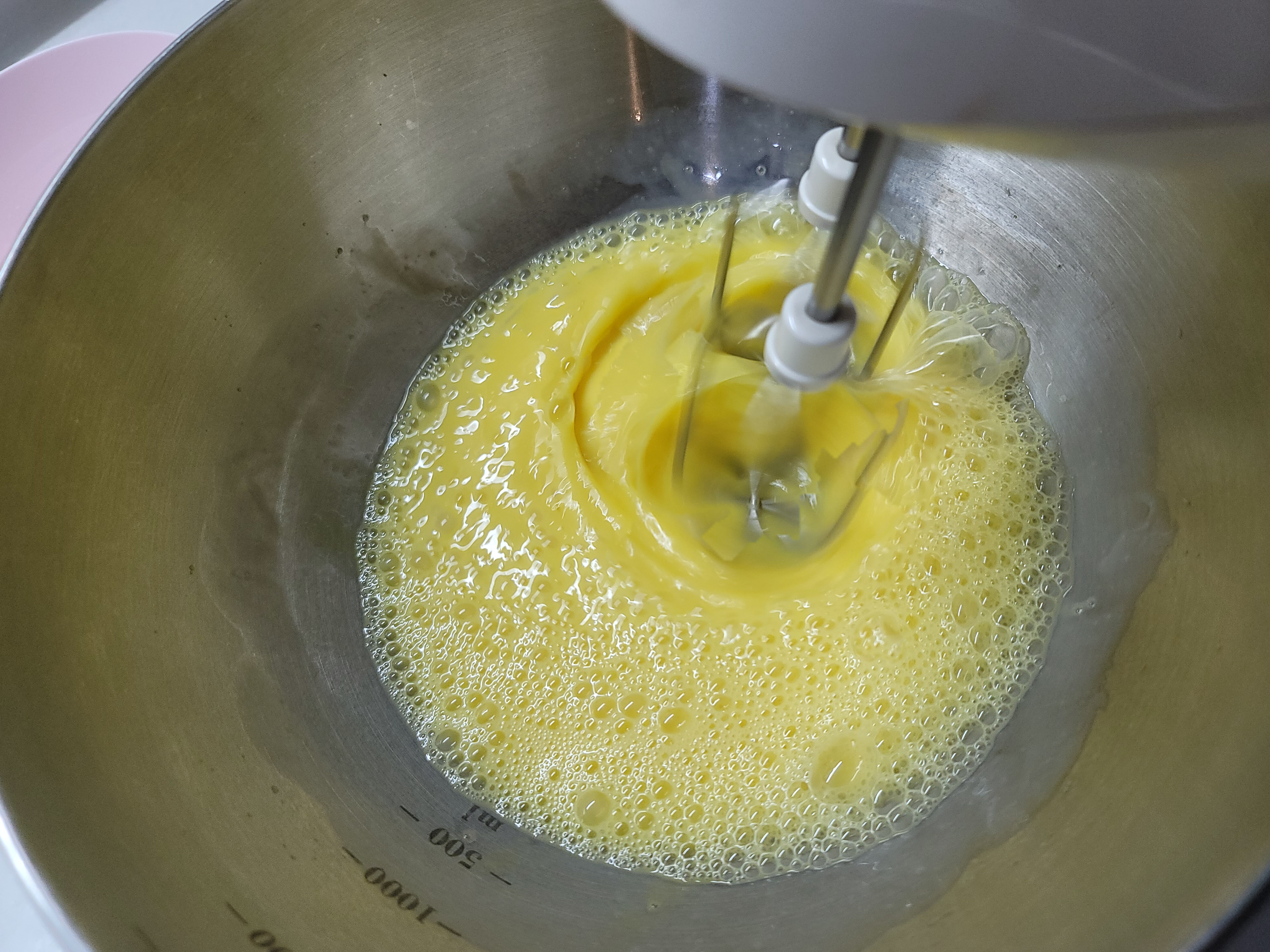 1. 실온에 둔 계란에 설탕을 나눠 넣으며 휘핑한다. 머랭기로 열심히 돌린다. 10분 이상 돌려야 거품이 풍성하게 생긴다.